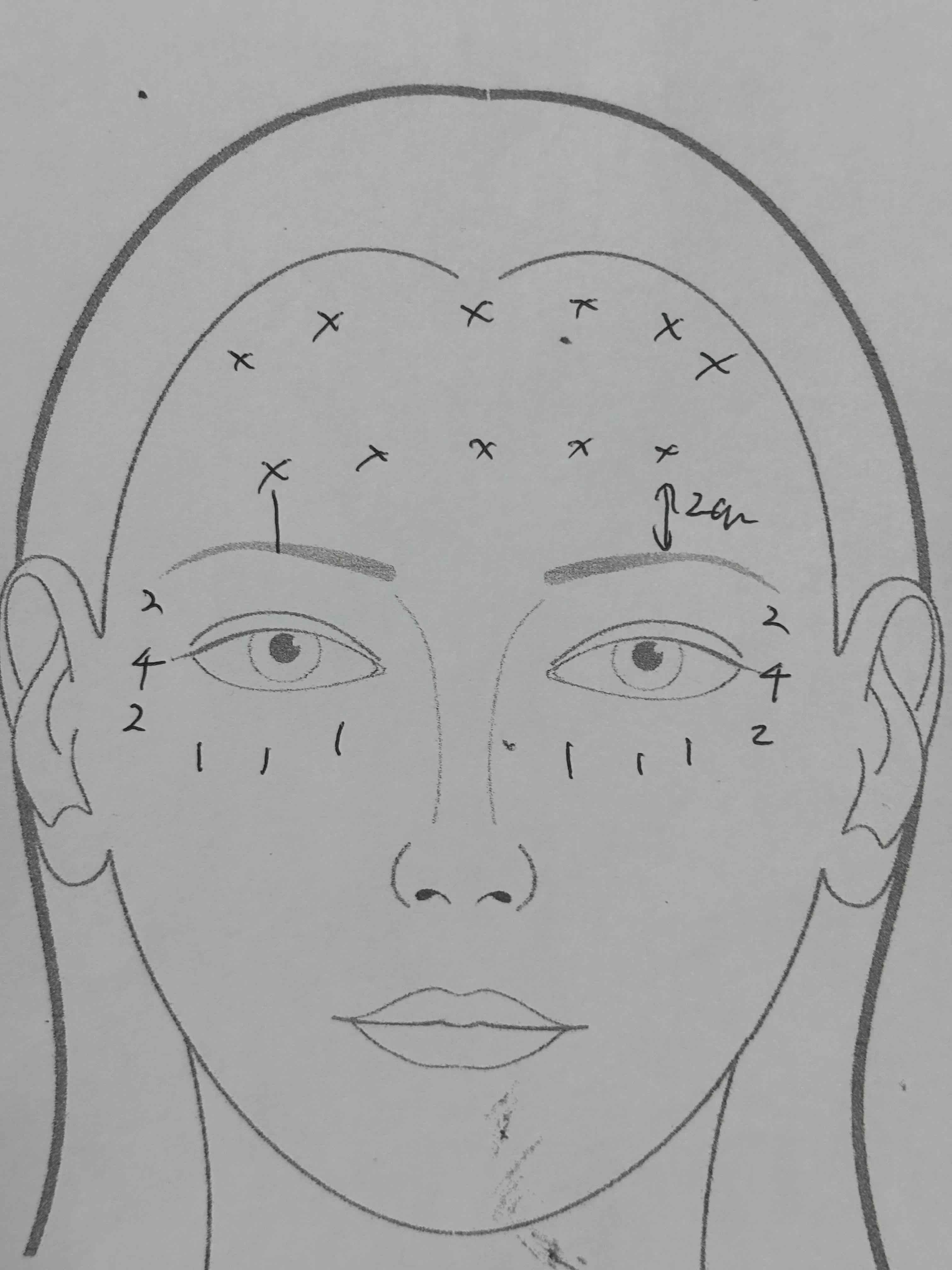 額に12箇所程度、目尻に左右それぞれ6箇所、注射しました。鏡みながら自己注射しています。