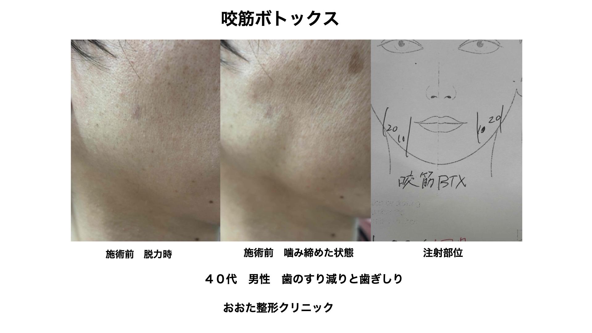 注射後1ヶ月くらいから、筋肉が痩せてくるので、アゴが「シュッとした」感じになります。また、歯ぎしりで歯が擦れるのも進行しなくなります。