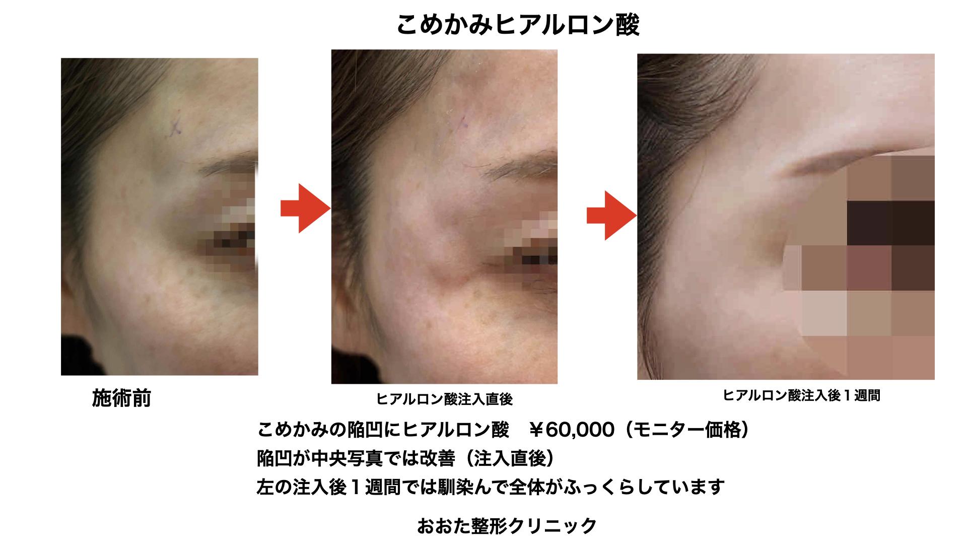 施術直後からこめかみの陥凹はなくなり、ここのラインがふっくらしてます。直後で少し凹凸がありましたが、1週間後のフォローアップ時にはこなれれて自然に仕上がりました。