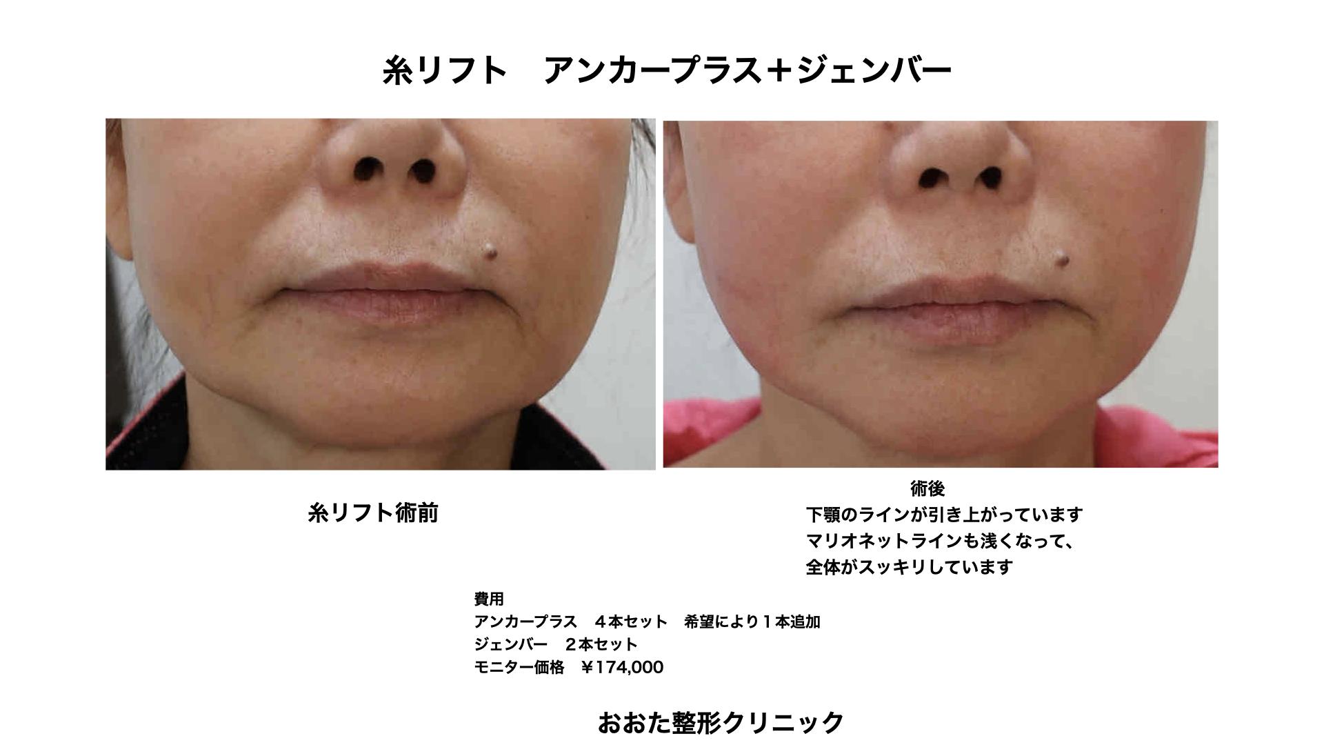 術後、満足はされましたが、左側をもう少し引き上げたいと言われたので、左アゴ部分にアンカープラスを1本追加した直後が左側の写真です。(同じ日の術前後です)